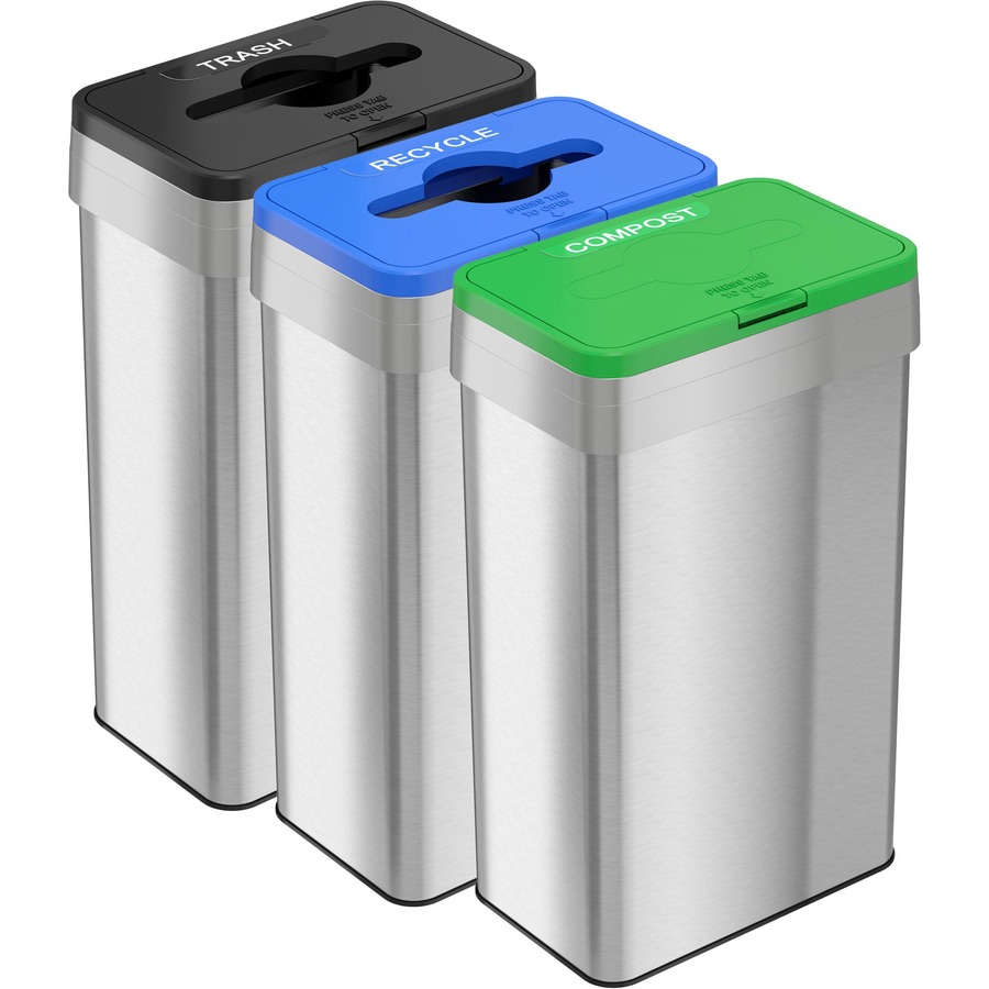 | Marketing Information | 21-Gallon Rectangular Open Top Trash Can Set makes it easy to sort trash in high-traffic venues like cafeterias, lobbies, kitchens, stores and more. Dual AbsorbX Odor Filters in each can neutralize odors to keep the surrounding area smelling fresh. Large-capacity design accommodates busy collection sites. Stylish, stainless steel body is fingerprint-proof and smudge-resistant to minimize cleanings. Lid attachments feature a solid color to quickly signal the type of trash that belongs in the bin. Large, capitalized letters on top help prevent confusion. Push-button release allows easy access to the bin. |